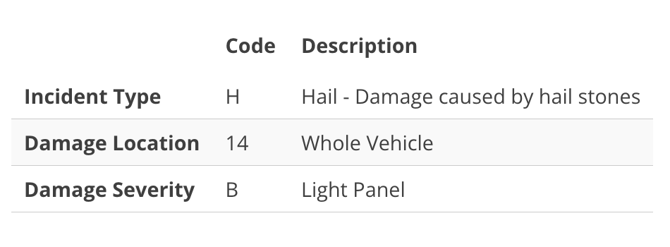 The code will be displayed, and then decoded. Using the above example of H14B [Hail | Whole vehicle | Light panel]:
