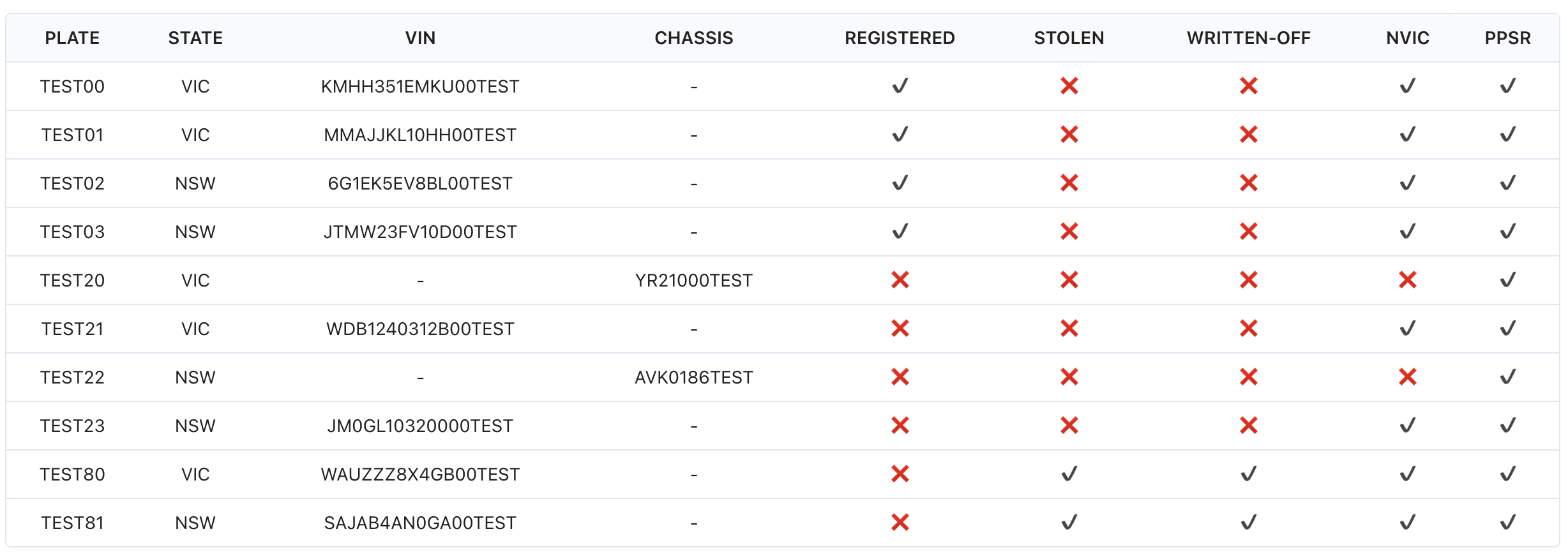 Genuine vehicle information is not available in Sandbox (test) mode. Instead, use any of the following test vehicles. All requests for these vehicles are free and must be made to the sandbox environment: https://sandbox.blueflag.com.au